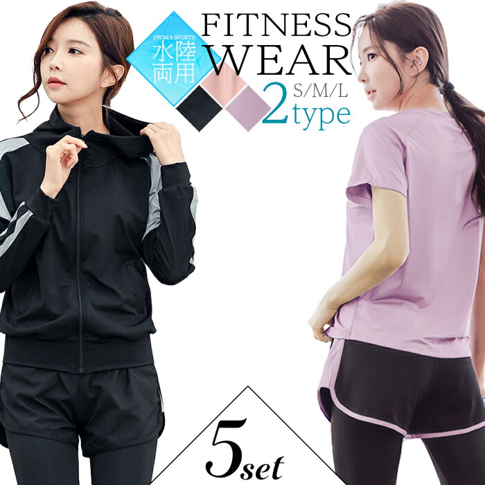 フィットネスウェア 5点セット 選べる2タイプ 水着 レディース 体型カバー 女性 長袖 スポブラ Tシャツ ショートパンツ 太もも ノンワイヤー パット入り 黒 グレー ピンク 無地 レギンス スポーツ ジョギング プール ヨガ 速乾 ジム 20代 30代 40代 50代 ママ 送料無料
