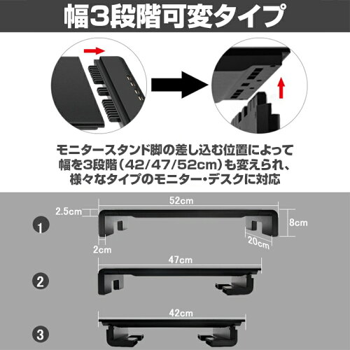 製品情報 大きさ 52×20×8cm 42×20×8cm 47×20×8cm 上記いずれかに可変 重さ 1020g USBポート 4口 USB2.0 可重量 15Kg モニターの高さを約8cm上げることができ、猫背防止につながることで肩こり腰痛を軽減できます。