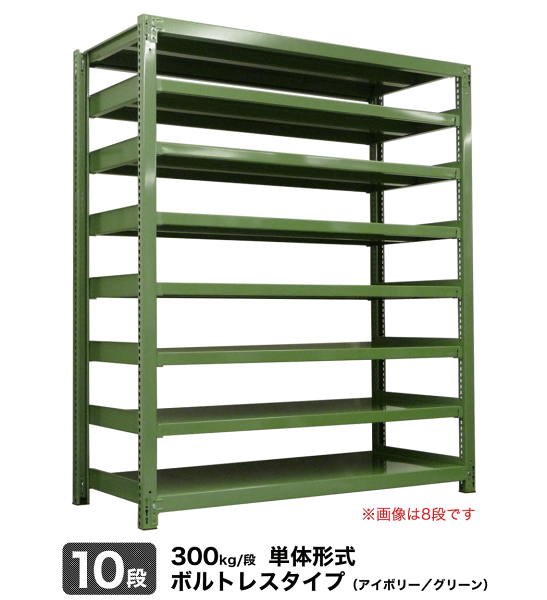 商品情報 商品名 イーグルスチールラック 業務用中量300kg/段ボルトレス 形式 単体(支柱4本) 表示寸法 幅90×奥行90×高さ240cm 実寸(外寸) 幅95.5×奥行93×高さ240.5cm 段数 10段(棚板枚数) 重量 152kg 1段当たりの耐荷重 静止均等耐荷重300kg 1台当たりの耐荷重 MAX2000kg カラー オリジナル アイボリー/グリーン 塗装 高級メラミン焼付塗装 材質 スチール(鉄)製 生産国 日本(完全国産品) 生産者 日本オフィス家具協会正会員製造グリーン購入法適合商品 補足情報 組立説明図 ※お届けの商品には同梱されておりません。