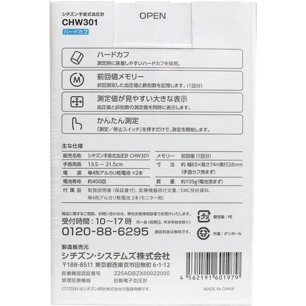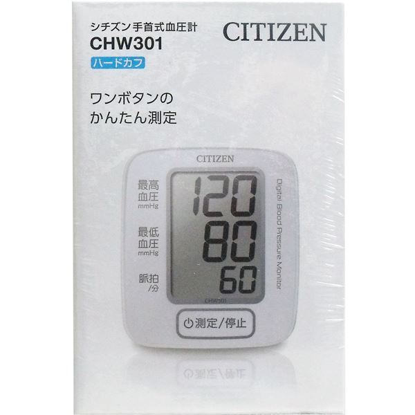 シチズン電子血圧計 手首式 CHW301商品区分:管理医療機器 (管理)(医療機器届出番号:225ADBZX00022000)●ハードカフ測定時に装着しやすいハードカフを採用●前回値メモリー前回測定した血圧値と脈拍数を測定します。